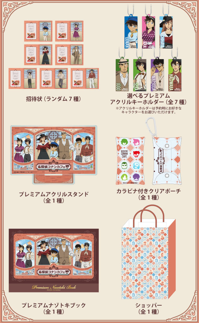 原創邀請函(7款隨機)、扣環透明小掛包、Premium壓克力立牌、Premium解謎書、Premium壓克力鑰匙圈(7款可選)、紙袋 | 事先進行Premium預約後當天入店時領取 | ※Premium預約價格¥715 ※預約後無法變更或取消 ※預約需使用日本電話號碼和地址先完成會員註冊 |